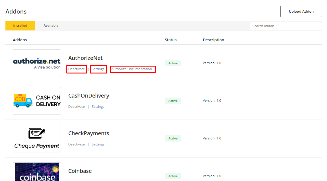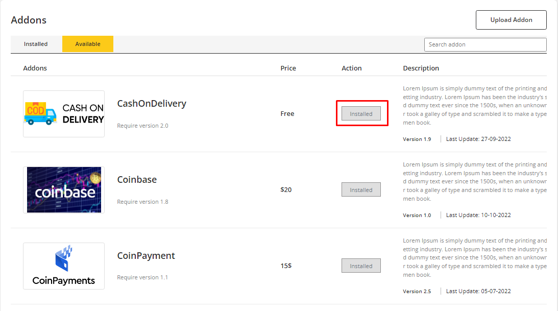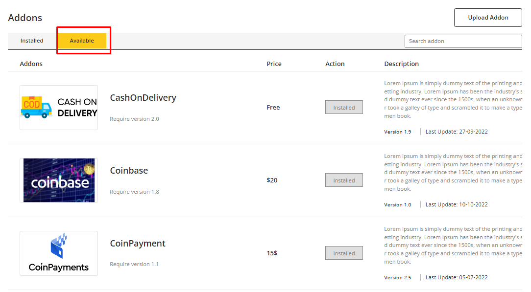- Go to Available Addons. It shows Available addons that can be used for this system.