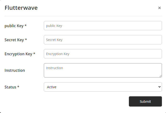 Public Key, Secret Key, Encryption Key are needed to configure Flutterwave.