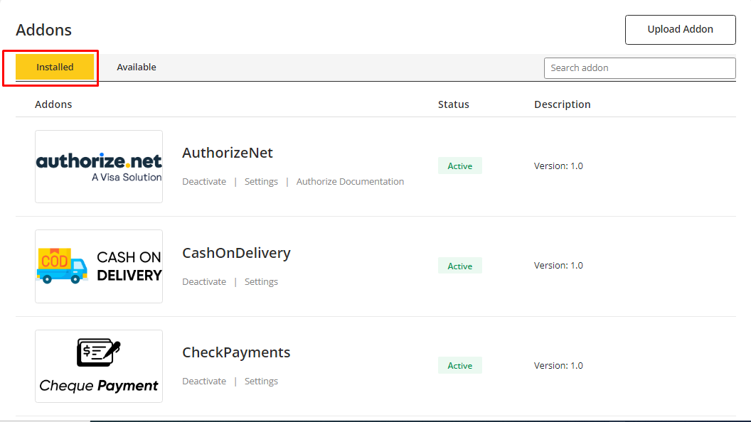Addonsfrom the sidebar. There are two available options for the addons,InstalledandAvailable Addons.