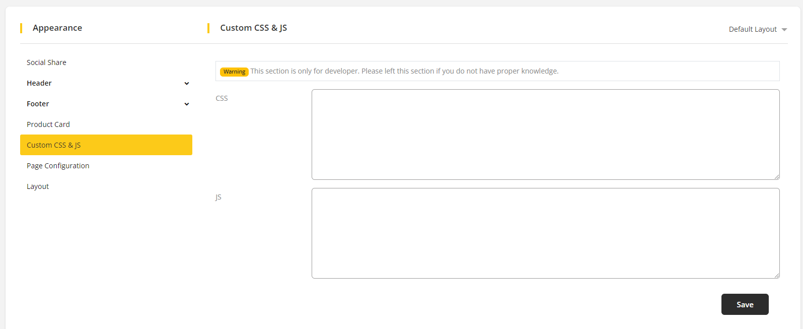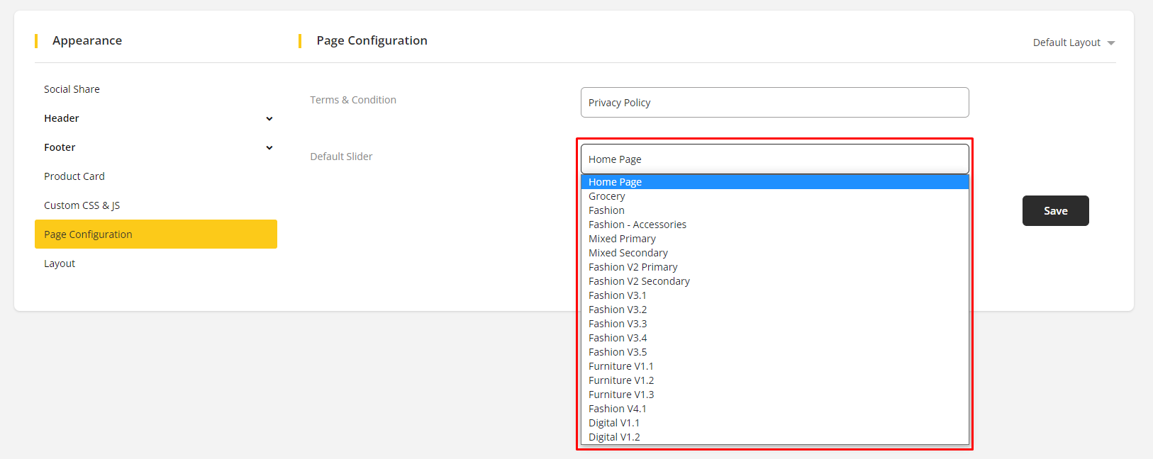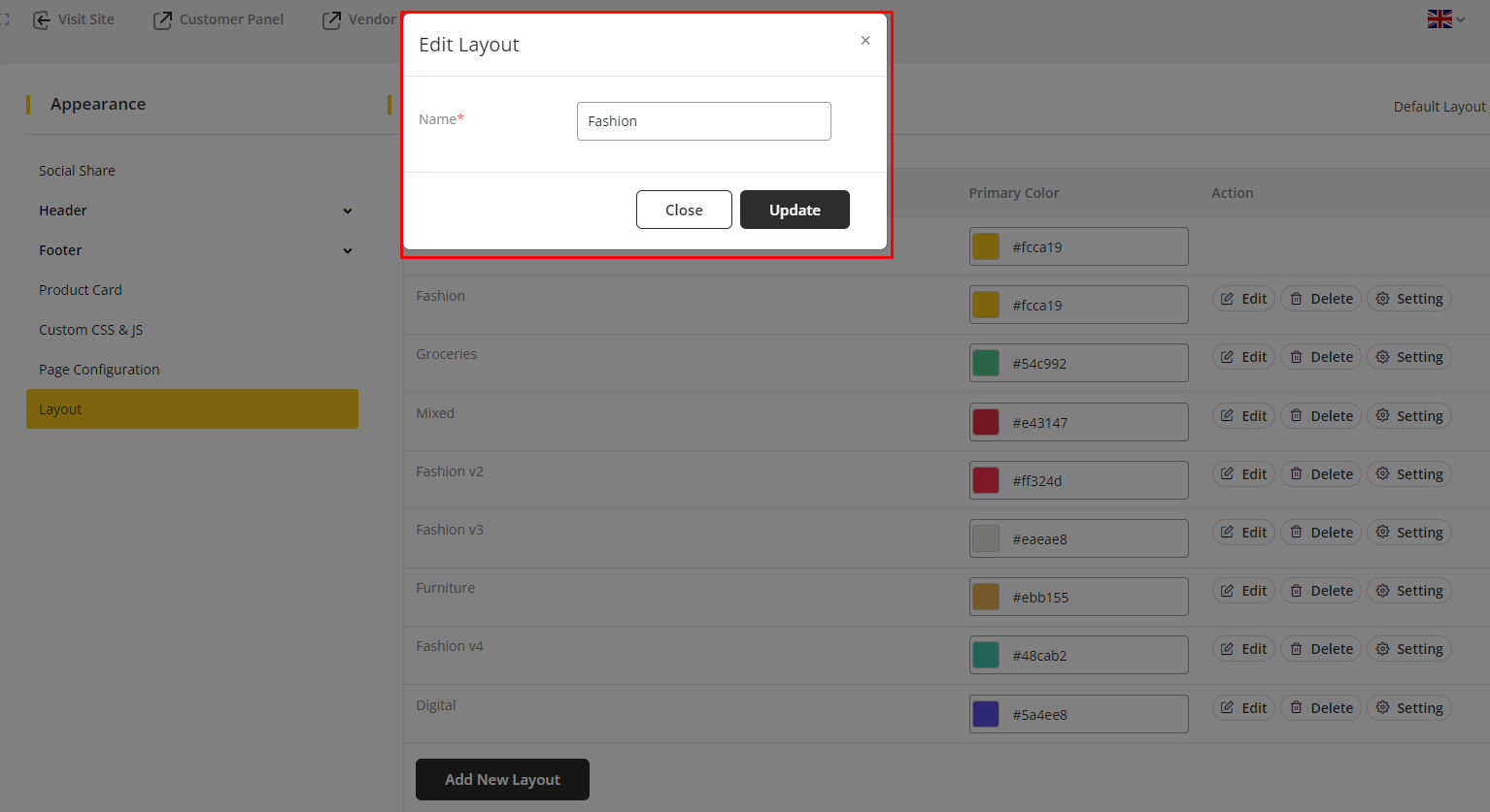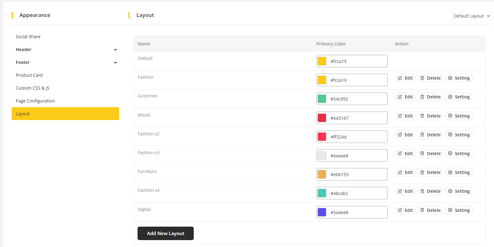 Setting, you can change the layout setting. - If you click on Setting of any layout, then it will show sections as per the layout, you can change or customize the appearance of this layout.
