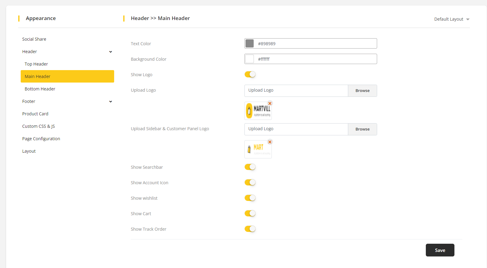 Search bar,Show Account Icon,Show Wishlist,Show CartandShow Track Orderis enable then it will show in the main header.