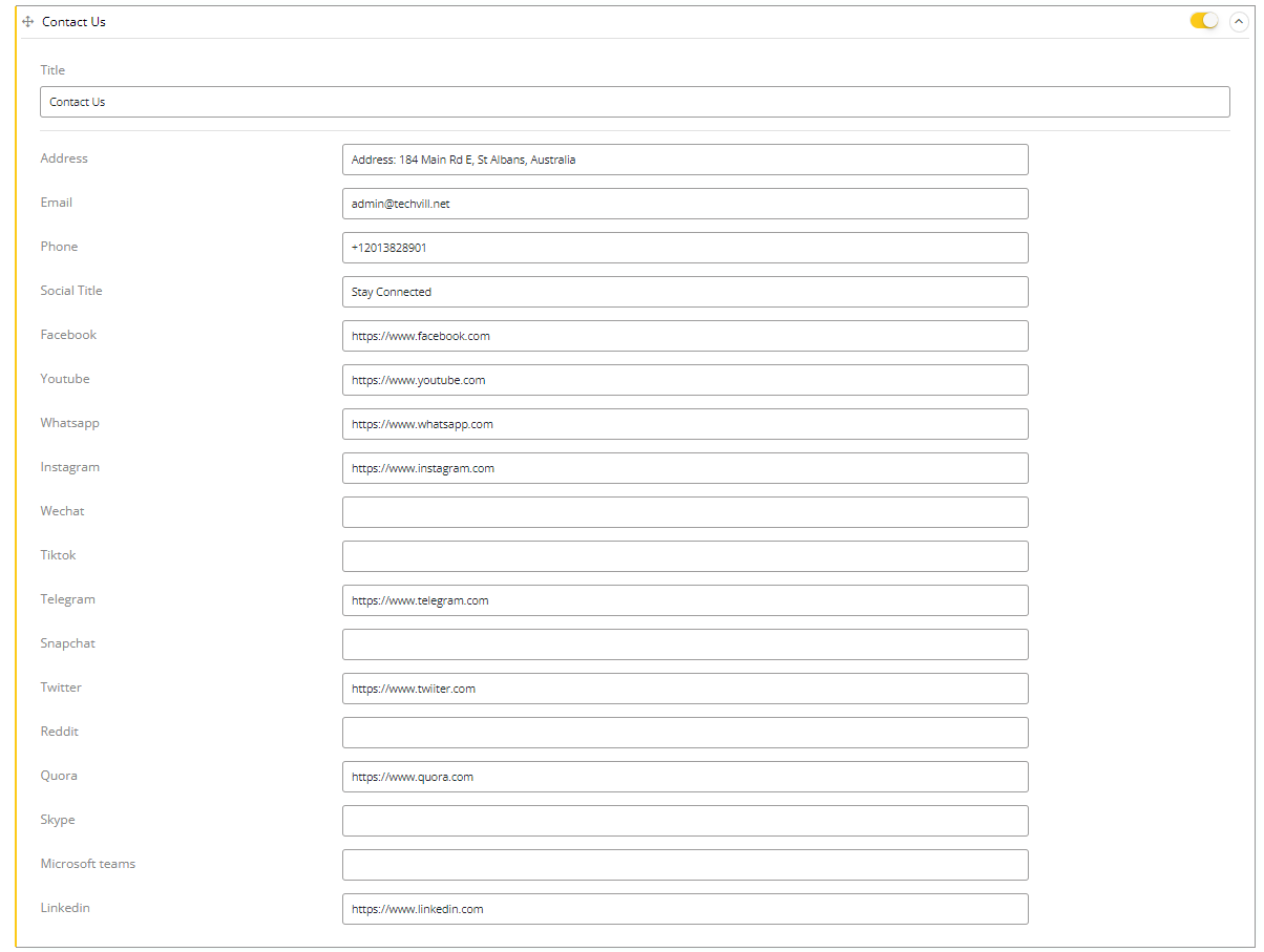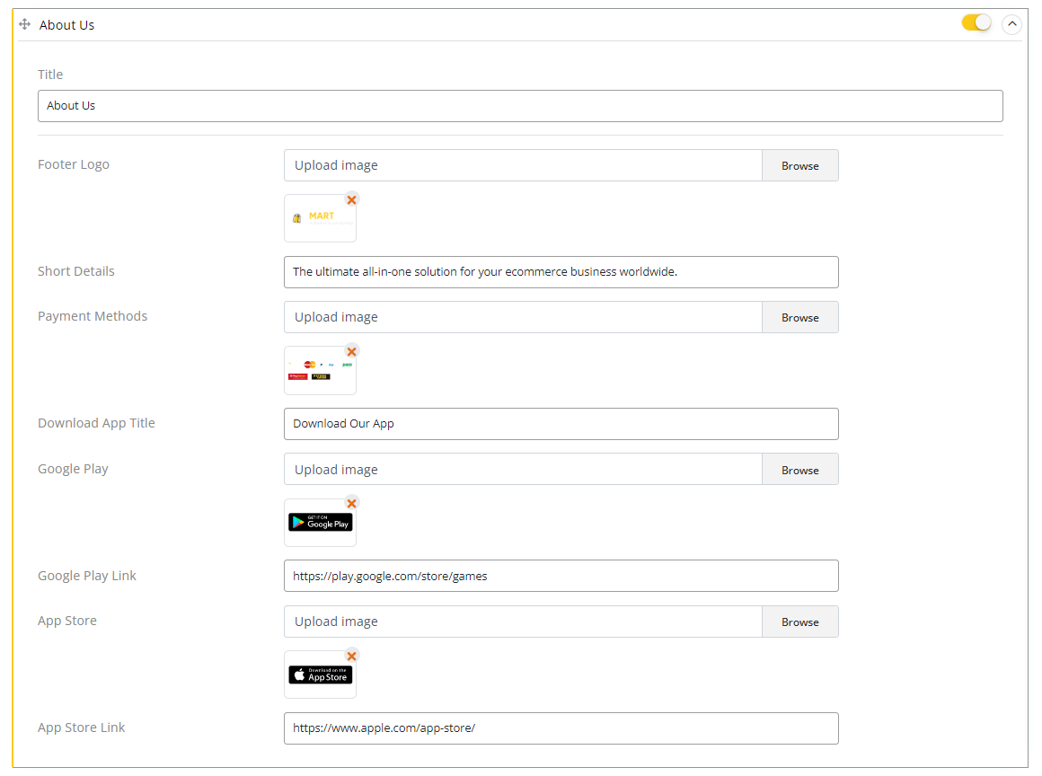 Imagefor Google Play and App store is same as previous section. Linkfields are same as previous section.- If the section is disable, then this elements will not show on the footer.