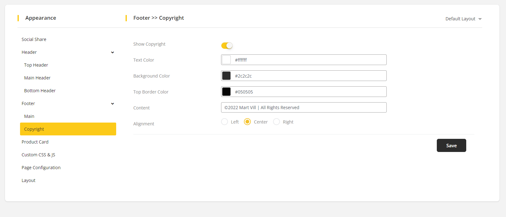 Show Copyrightis enable, then the copyright section will show on footer. Colorfields are same as previous section.- Fill up the