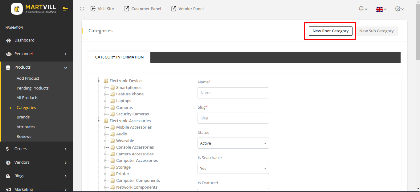 - Go to MartVill Dashboard > Products > Categories and Click on New Root Category or just fill-up the form with required information.