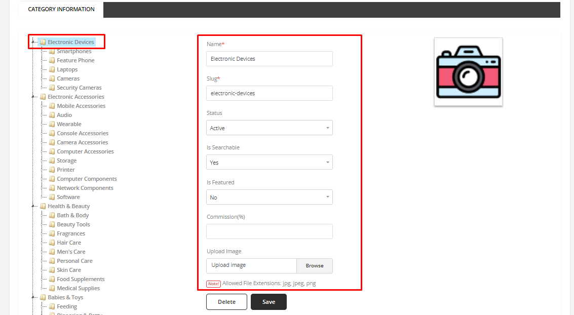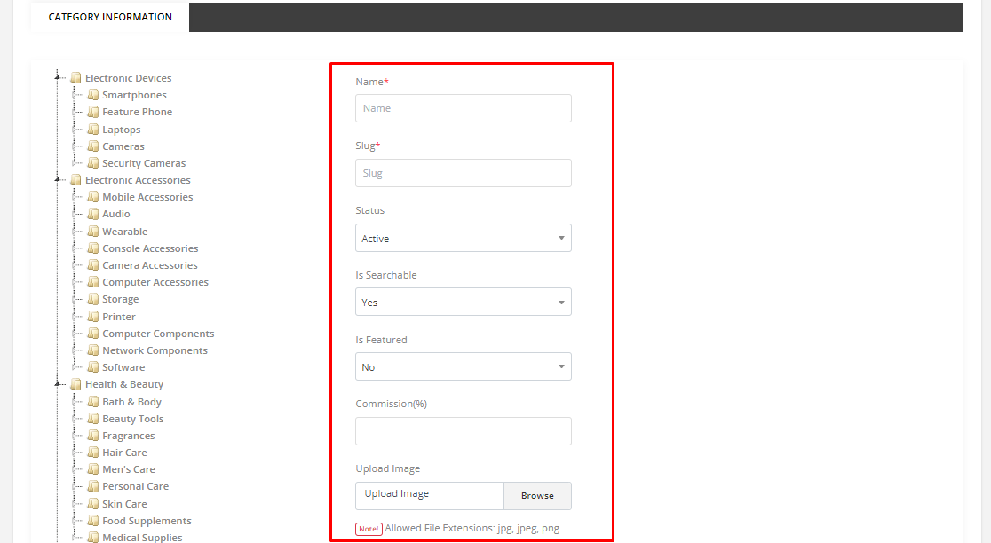 - Select a category from the category list and click on it. The information of that category will show in the form.