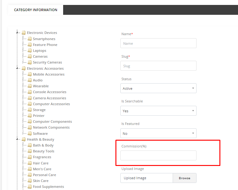 You can set the percentage of the commission while adding a root category or a sub category to the system. If Vendor does not have commission set then the category based commission will be counted. Commission will be cut off according to the category on every order.
