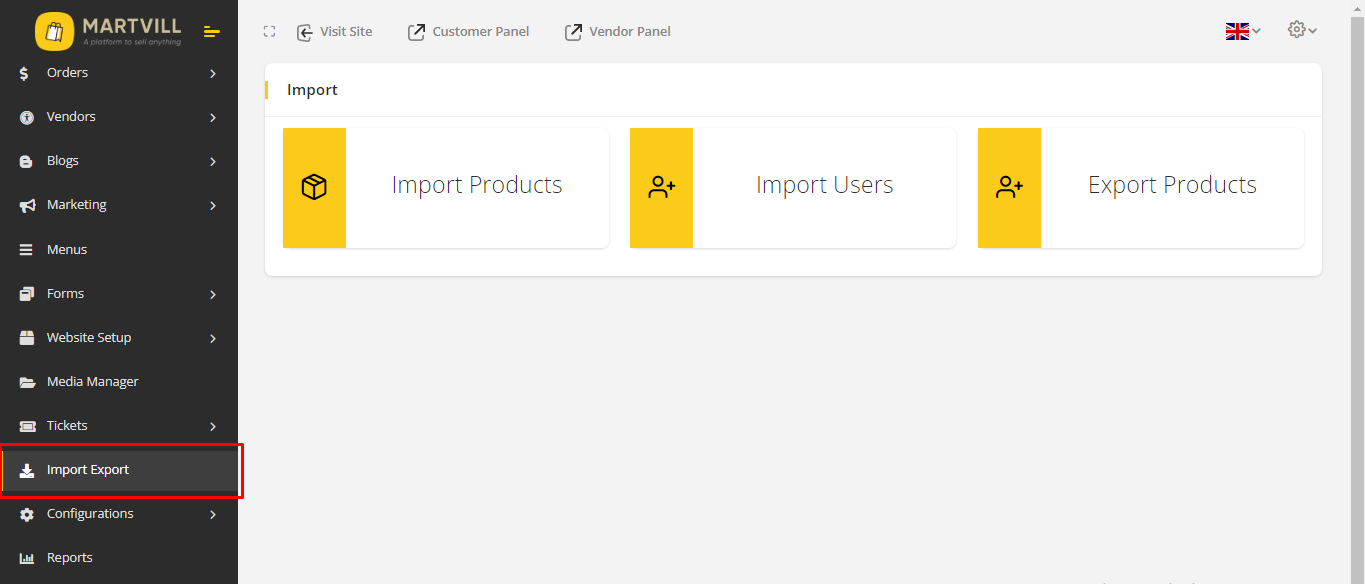 Go to MartVill Dashboard > Import Export from the sidebar. There are two options, Import Products and another one is Import Users.
