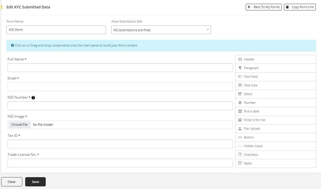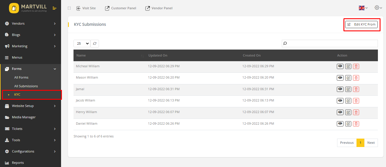 - Go to MartVill Dashboard > Forms > KYC and Click on Edit KYC Form.