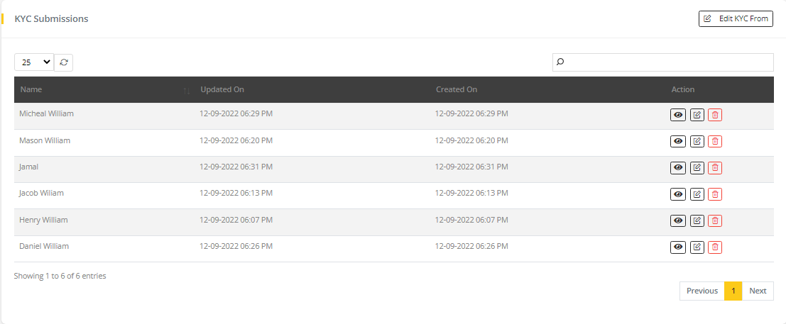 All Submitted form list will appear when navigate to KYC page. And to view the submitted form click on View icon.