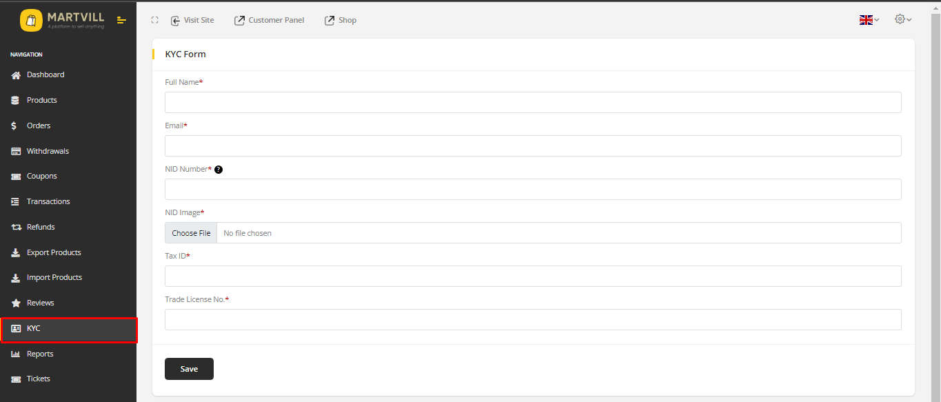 - Go to MartVill Vendor Dashboard > KYC and the form will appear. Fill up the form and Click on submit.