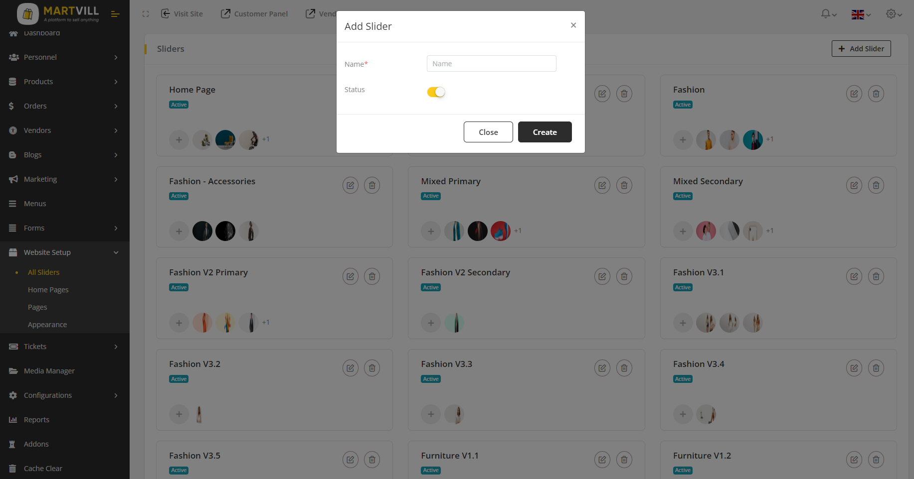 1. Go to Website Setup->All Sliders from the sidebar. An existing slider list will appear.
