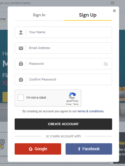 - In order to create an account, a user has to go to the sign up page. Go to MartVill Homepage and Click on Accounts from upper navigation bar. Then click on Sign up